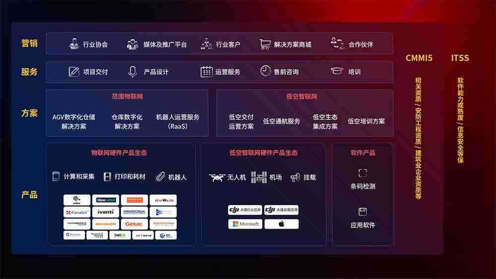 聚合国内外先进的物联网硬件产品品牌,,,,聚焦数字化仓储、、、、机器人运营、、、低空智联网等领域,,,共同打造适合客户业务场景的解决方案并提供交付服务