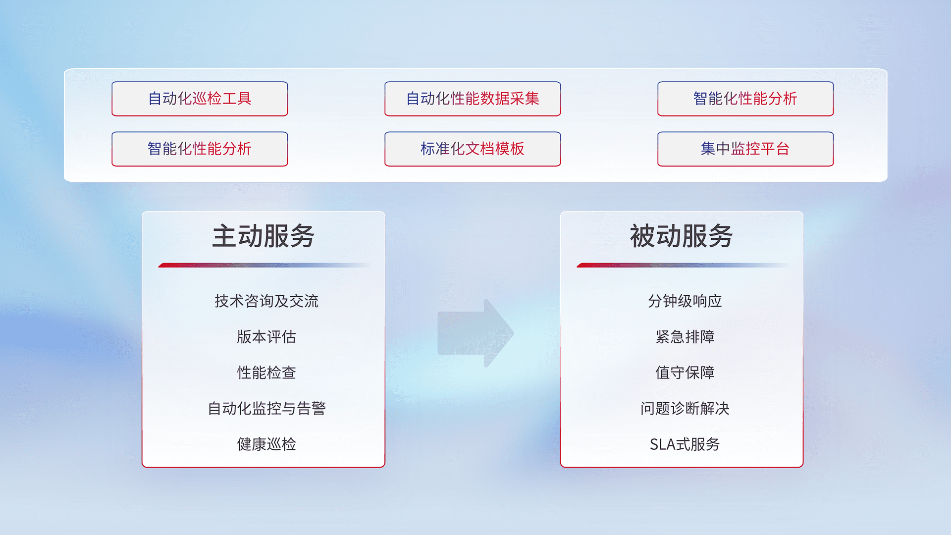智能化工具和标准化文档,,,,保障服务质量,,,提供主动服务(包含技术咨询、、版本评估、、、、性能检查、、、自动化监控与告警、、健康巡检)和被动服务包含(分钟级响应、、、紧急排障、、、值守保障、、问题诊断解决、、SLA服务)。。。