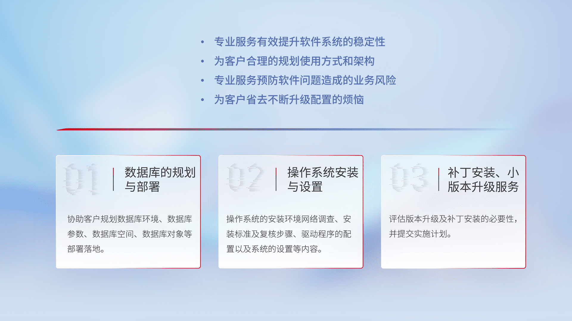 为客户提供软件规模升级、、快速部署、、、、按需配置的专业服务,,,从数据库的规划与部署到操作系统的安装与设置,,,,再到补丁安装和小版本升级提供支持。。。。